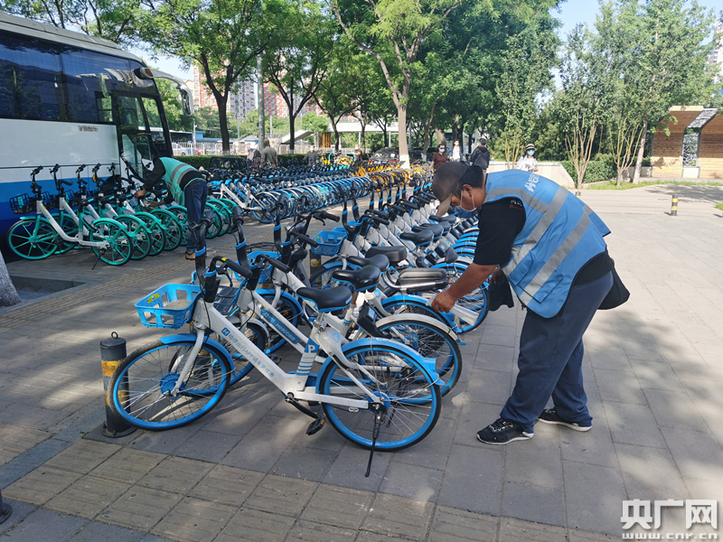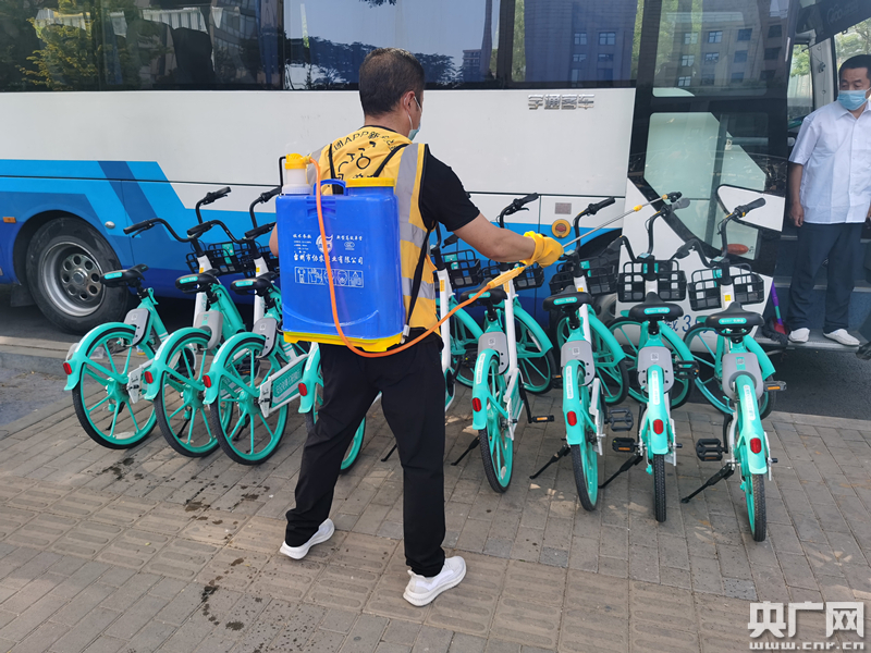 工作人員正在給共享單車(chē)進(jìn)行重點(diǎn)局部消毒(央廣網(wǎng)記者 劉一荻 攝)