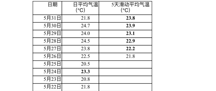 中華人民共和國氣象行業(yè)標準——《氣候季節(jié)劃分》規(guī)定:當年五日滑動平均氣溫序列連續(xù)5天大于或等于22℃,則以其所對應(yīng)的當年氣溫序列中第一個大于或等于22℃的日期作為夏季起始日,如果初次判斷的起始日期比常年偏早15天以上,需進行起始日的二次判斷。