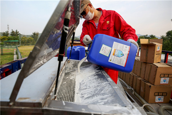 北京市林業(yè)保護站的工作人員為飛機添加除蟲害藥劑(央廣網(wǎng)發(fā) 北京市園林綠化局供圖)
