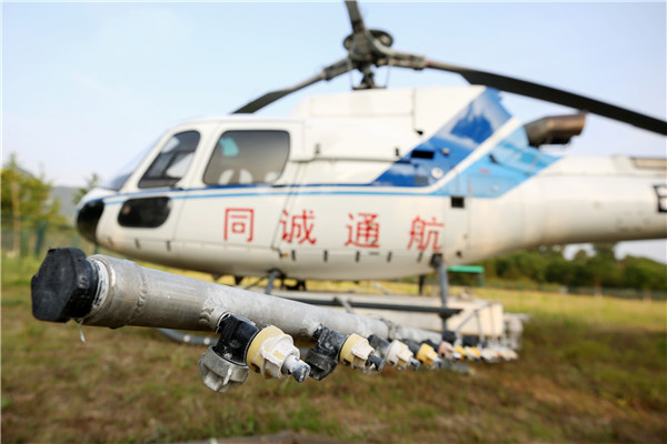 飛機防治的每畝用藥量僅20克,遠低于人工地面防治方式(央廣網(wǎng)發(fā) 北京市園林綠化局供圖)