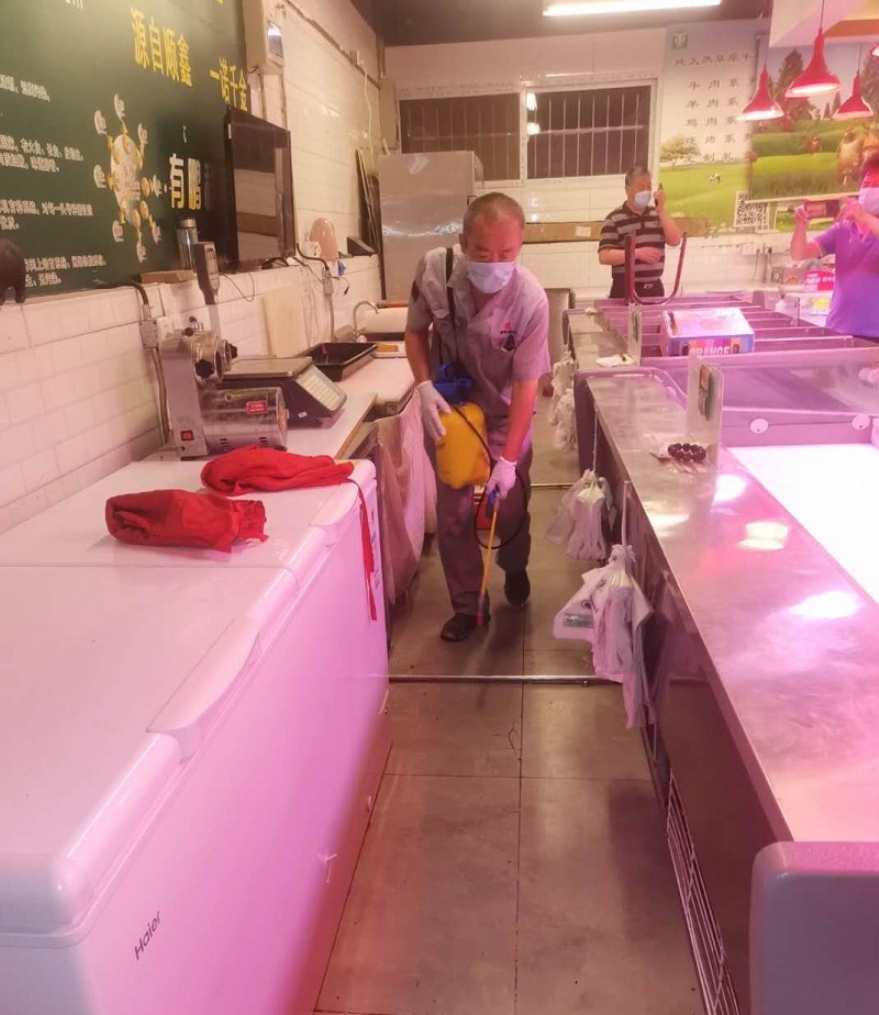 北京市石景山區(qū)老山街道對10家便民菜站、生鮮市場和63家餐飲單位進行嚴格消殺(央廣網(wǎng)發(fā) 北京市石景山區(qū)老山街道供圖)