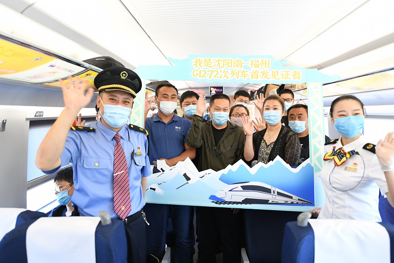 7月1日首發(fā)的沈陽(yáng)南至福州G1272次列車(chē)上,擔(dān)當(dāng)乘務(wù)的中國(guó)鐵路沈陽(yáng)局集團(tuán)有限公司錦州客運(yùn)段乘務(wù)員在提供溫馨服務(wù)的同時(shí),與旅客開(kāi)展首發(fā)紀(jì)念活動(dòng),豐富旅途生活(央廣網(wǎng)發(fā) 沈陽(yáng)鐵路供圖)