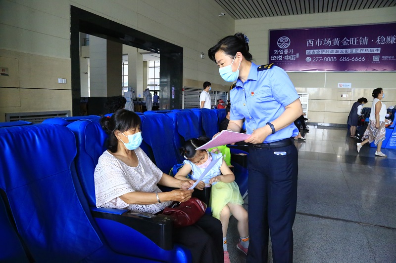 2020年7月1日,沈陽(yáng)鐵路延吉車(chē)務(wù)段延吉站職工向旅客講解列車(chē)調(diào)圖信息、列車(chē)時(shí)刻變化、動(dòng)車(chē)票價(jià)優(yōu)惠及暑運(yùn)期間鐵路部門(mén)推出的便民利民措施(央廣網(wǎng)發(fā) 沈陽(yáng)鐵路供圖)