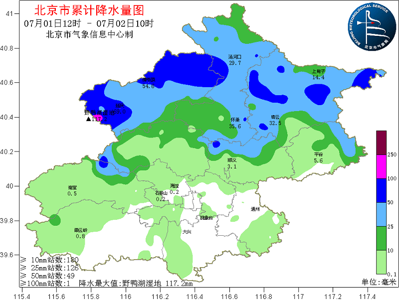 7月1日12時(shí)至2日10時(shí)北京市累計(jì)降水量分布圖(央廣網(wǎng)發(fā) 圖片來源:北京市氣象局)