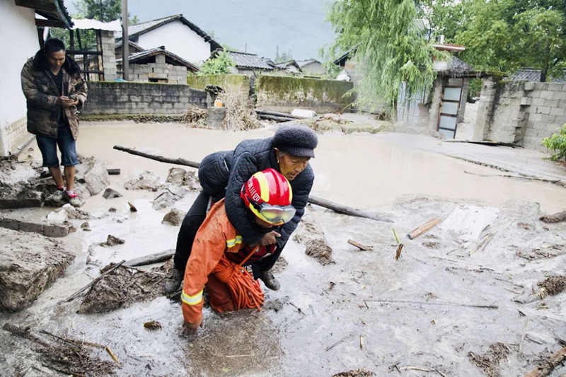 6月27日,四川涼山州大煲子村,搜救人員背出被困老人(央廣網(wǎng)發(fā) 應(yīng)急管理部消防救援局供圖)