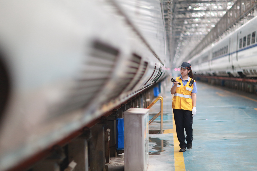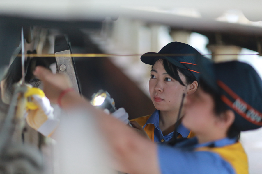 7月進(jìn)入暑運(yùn)以來(lái),該工區(qū)異常忙碌,平均年齡只有27歲的女子檢測(cè)組隊(duì)員定期對(duì)車載設(shè)備進(jìn)行出庫(kù)前的精檢細(xì)修,確保動(dòng)車組安全運(yùn)行。