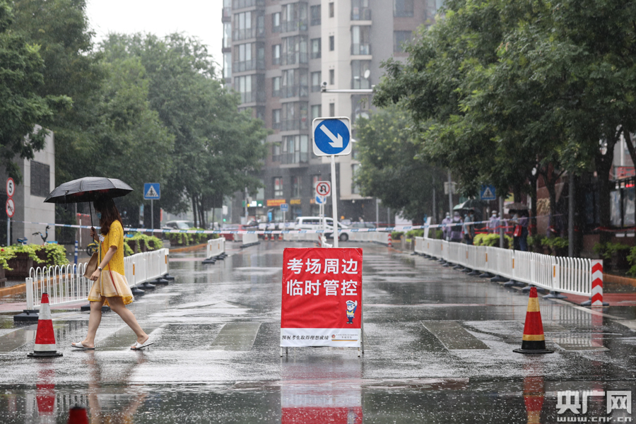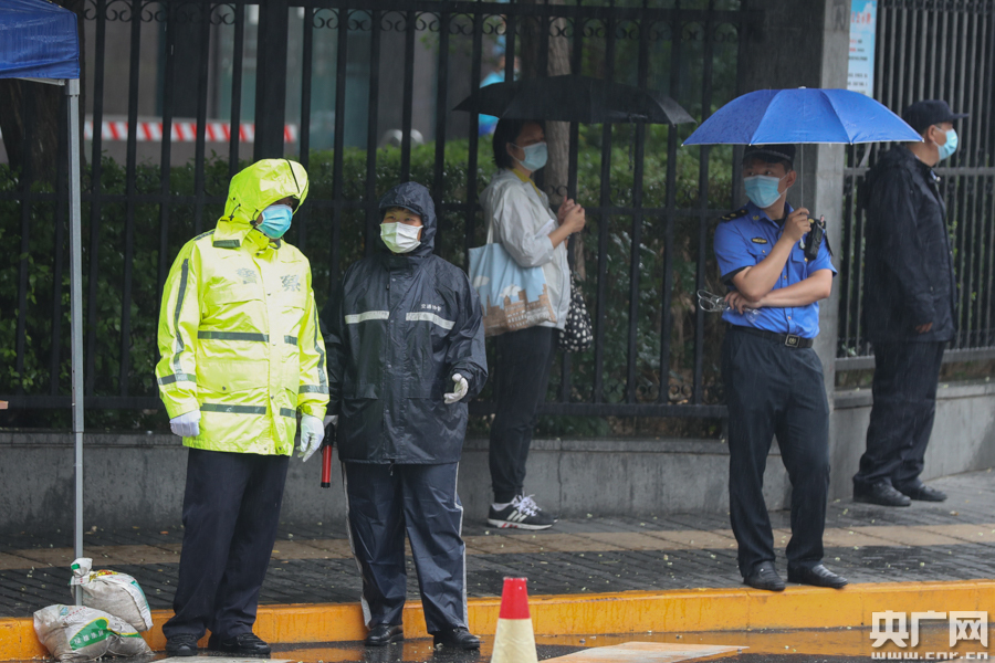 7月9日,北京廣渠門中學(xué)考點,工作人員冒雨維持考場周邊秩序(央廣網(wǎng)記者 韓靖 攝)