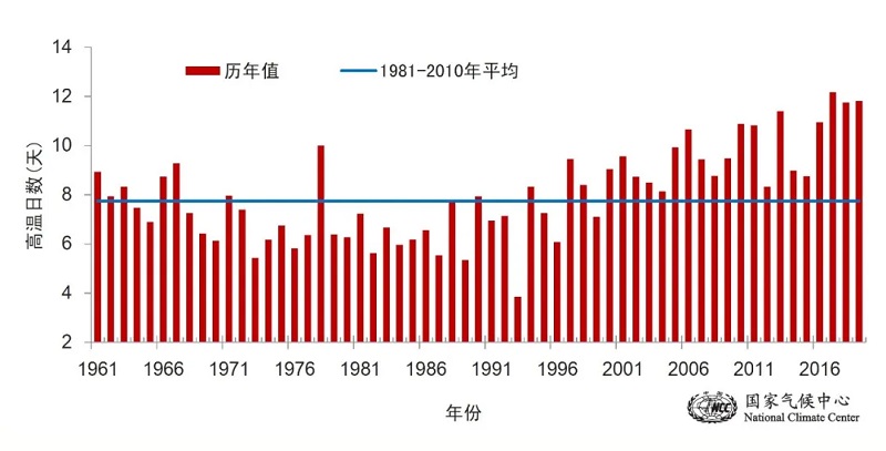 1961年至2019年全國平均高溫日數(shù)歷年變化(央廣網(wǎng)發(fā) 來源:國家氣候中心)