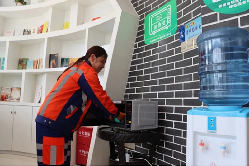 貴州省貴陽市花溪環(huán)衛(wèi)職工休息站,方便戶外工作者歇腳納涼,場所寬敞,設(shè)施完備,室內(nèi)外環(huán)境優(yōu)良,有專人維護(hù)。圖為一位環(huán)衛(wèi)工人在服務(wù)站內(nèi)加熱午飯(央廣網(wǎng)發(fā) 貴州省總工會權(quán)益保障與法律工作部供圖)