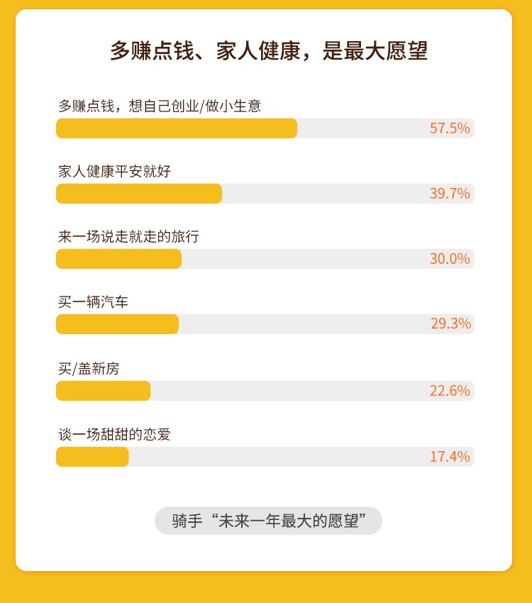 報(bào)告同時(shí)顯示,騎手“未來生活信心度”也從2019年的3.88上升到2020年上半年的3.97(滿分為5分)。對于未來,多數(shù)騎手的最大愿望是“多賺點(diǎn)錢,想自己創(chuàng)業(yè)或做小生意”“家人健康平安就好”;也有不少人向往一場甜甜的戀愛、一次說走就走的旅行……