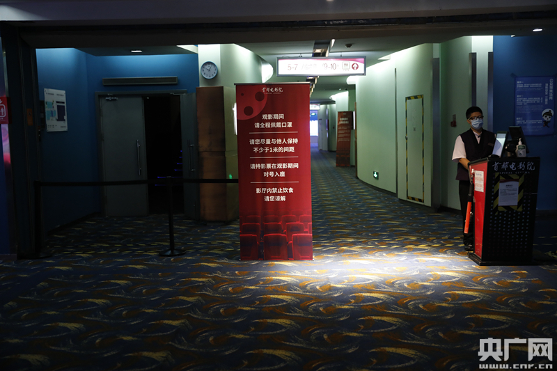 圖為工作人員對(duì)影院走廊進(jìn)行消殺(央廣網(wǎng)記者 張凱航 攝)