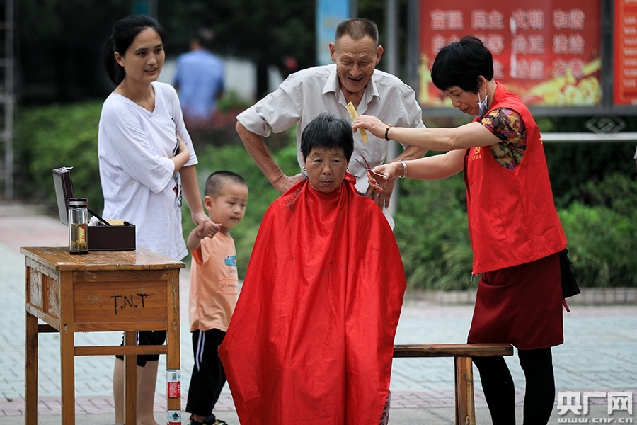 志愿者為安置點內(nèi)的受災(zāi)群眾理發(fā)(央廣網(wǎng)記者石昊鑫 攝)