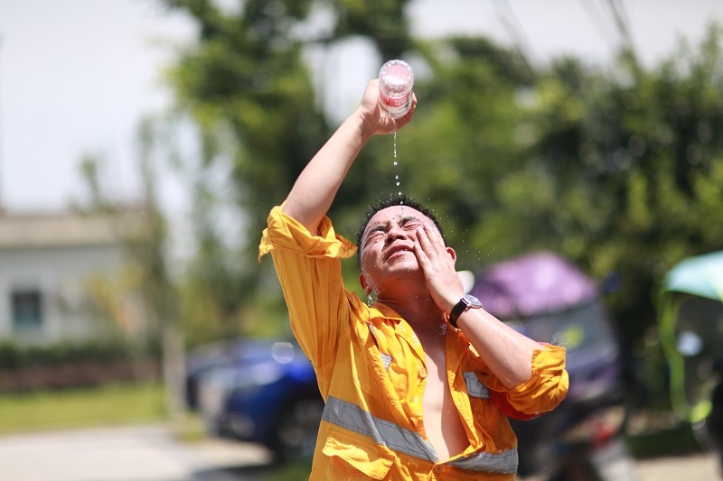 一名工人往臉上澆水降溫(央廣網(wǎng)發(fā) 蘇志剛 攝)