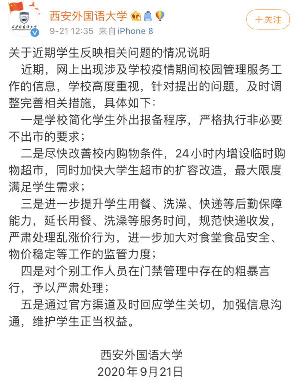 西安外國語大學通過官方微博回應稱,近期,網上出現(xiàn)涉及學校疫情期間校園管理服務工作的信息,學校高度重視,針對提出的問題,及時調整完善相關措施,涉及外出報備程序、校內后勤保障等諸多方面。包括簡化學生外出報備程序,嚴格執(zhí)行非必要不出市的要求;盡快改善校內購物條件,24小時內增設臨時購物超市;進一步提升學生用餐、洗澡、快遞等后勤保障能力,延長用餐、洗澡等服務時間,規(guī)范快遞收發(fā),嚴肅處理亂漲價行為,進一步加大對食堂食品安全、物價穩(wěn)定等工作的監(jiān)管力度;并對個別工作人員在門禁管理中存在的粗暴言行,予以嚴肅處理;加強信息溝通,維護學生正當權益。