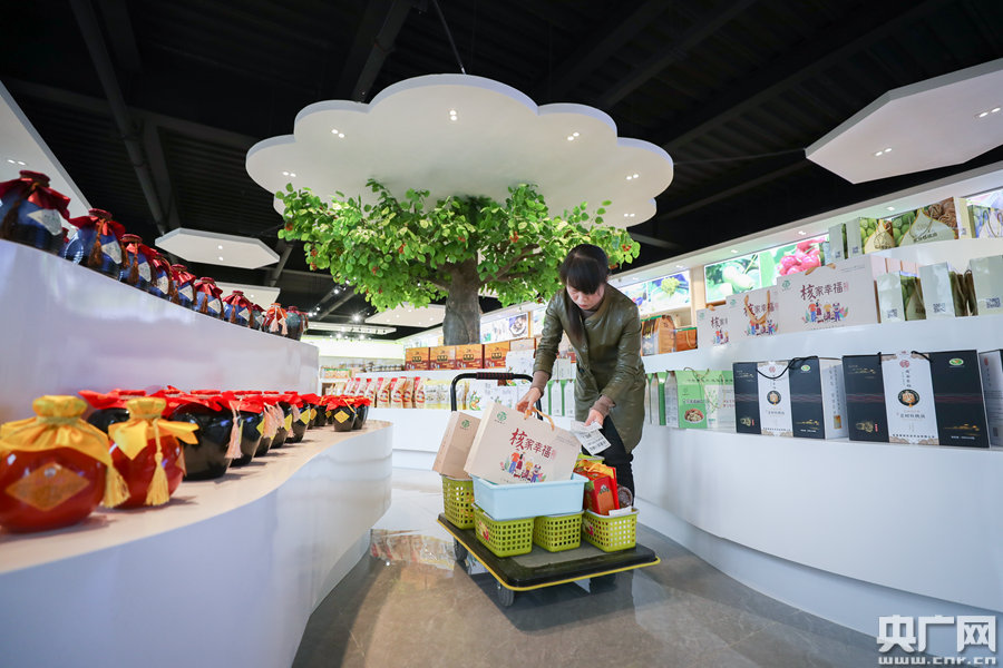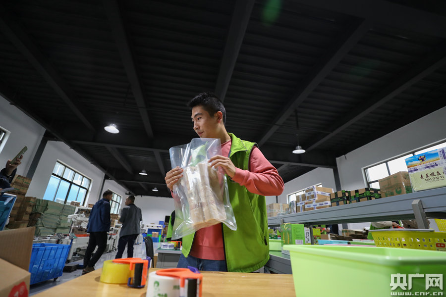 隴小南網(wǎng)貨供應(yīng)中心產(chǎn)品展廳內(nèi),工作人員正在配貨(央廣網(wǎng)記者 韓靖 攝)