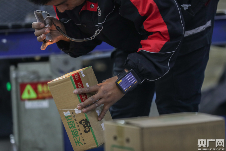 快遞員的新式穿戴設(shè)備可以有效提高工作效率(央廣網(wǎng)記者 韓靖 攝)