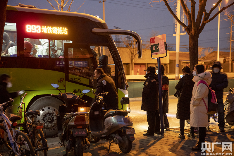 上班族們正在白廟檢查站附近登上前往北京國貿(mào)的大巴車(央廣網(wǎng)記者 張佳琪 攝)