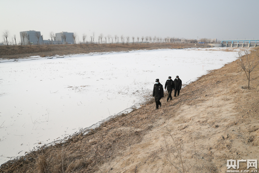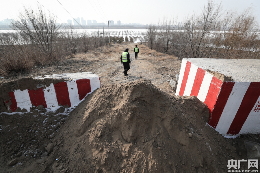 榆垡鎮(zhèn)王屯段河堤上,防疫人員正在巡視(央廣網記者 韓靖 攝)