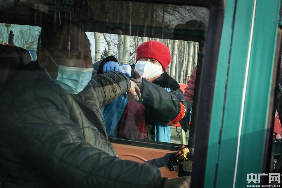 執(zhí)勤人員正在為進村人員測量體溫(央廣網記者 韓靖 攝)
