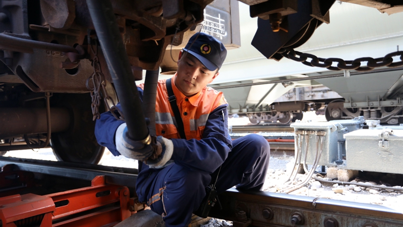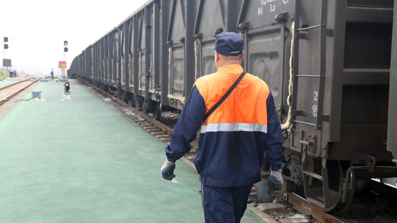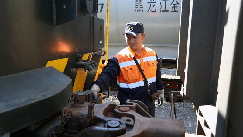 作為中國鐵路沈陽局集團有限公司管內(nèi)的編組站,金州站地處沈大鐵路、丹大快速鐵路和金窯、金城專用鐵路4條鐵路線交會處,站場由客場和運轉場兩部分組成,主要承擔4條鐵路線的列車到發(fā)和解編作業(yè)。今年45歲的調(diào)車長宋倫政,已經(jīng)在調(diào)車場上工作了十多個年頭。10時10分,調(diào)車組接到1調(diào)車組第4次調(diào)車作業(yè)計劃后,在1場7道掛46輛車,宋倫政帶領“鉤子手”從南走到北,對?康囊涣胸涍\列車逐一進行“勾、管、閘”檢查。