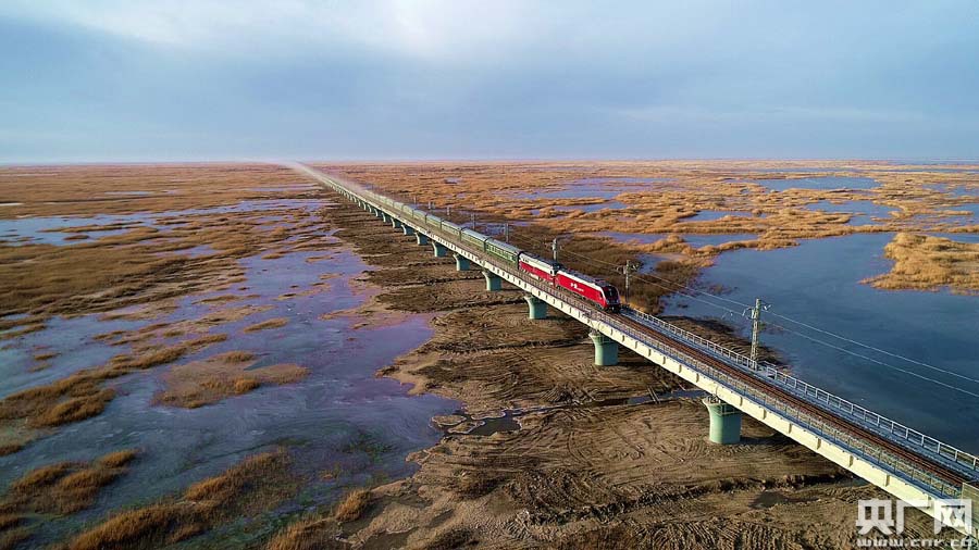 綜合檢測列車駛過臺特瑪湖大橋(央廣網(wǎng)發(fā) 陳劍飛攝)