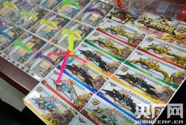 新疆伊寧警方收繳的牙簽弩等危險(xiǎn)玩具(央廣網(wǎng)發(fā) 楊新萍 攝) 央廣網(wǎng)伊寧7月11日消息(記者張雷 通訊員楊新萍)新疆伊寧市警方近日圍剿風(fēng)靡中小學(xué)生校園的危險(xiǎn)玩具“牙簽弩”,及時(shí)消除安全隱患。 “牙簽弩”價(jià)格低廉,價(jià)格在5-10元左右,方便購買,易于攜帶,且殺傷力大。小小一根牙簽,架在巴掌大的弩弓上,就可以輕松擊穿紙杯,射程最遠(yuǎn)可達(dá)20米,而在3米內(nèi)的距離內(nèi),可以輕松擊穿6毫米的硬紙板、射爆氣球、插進(jìn)蘋果、石膏板等。中小學(xué)生一旦在游戲過程中對射,后果難以想象,存在巨大的校園安全隱患。 因“牙簽弩”多是涉及中小學(xué)生,有關(guān)學(xué)生安全問題易成為社會敏感話題,成為社會議論熱點(diǎn)。針對此事件,伊寧市公安局治安部門迅速行動,對轄區(qū)中小學(xué)門口小賣部進(jìn)行摸排,開展違法銷售“牙簽弩”行為集中整治行動。同時(shí)組織各派出所法制副校長深入校園加大教育宣傳力度,讓廣大家長和學(xué)生充分認(rèn)識“牙簽弩”的危險(xiǎn)性,學(xué)校老師和家長的配合教育孩子拒絕購買和使用。 6月27日晚,治安大隊(duì)獲悉線索,對伊寧市某小學(xué)旁商店進(jìn)行突擊檢查,查繳“牙簽弩”22個(gè),硬制塑料弓箭20個(gè),鐵刺拳套2個(gè)。經(jīng)調(diào)查,民警又于6月28日在伊寧市某幼兒園巷內(nèi)商店查繳牙簽弩1個(gè),蝴蝶刀3把;在對某玩具城進(jìn)行突擊安檢查中,查繳仿真手槍12支,塑料子彈230發(fā),王者劍3把,王者斧頭1把。 目前,伊寧市公安局對校園周邊的商店、攤位的檢查和“牙簽弩”等危險(xiǎn)玩具的收繳工作仍在開展中。