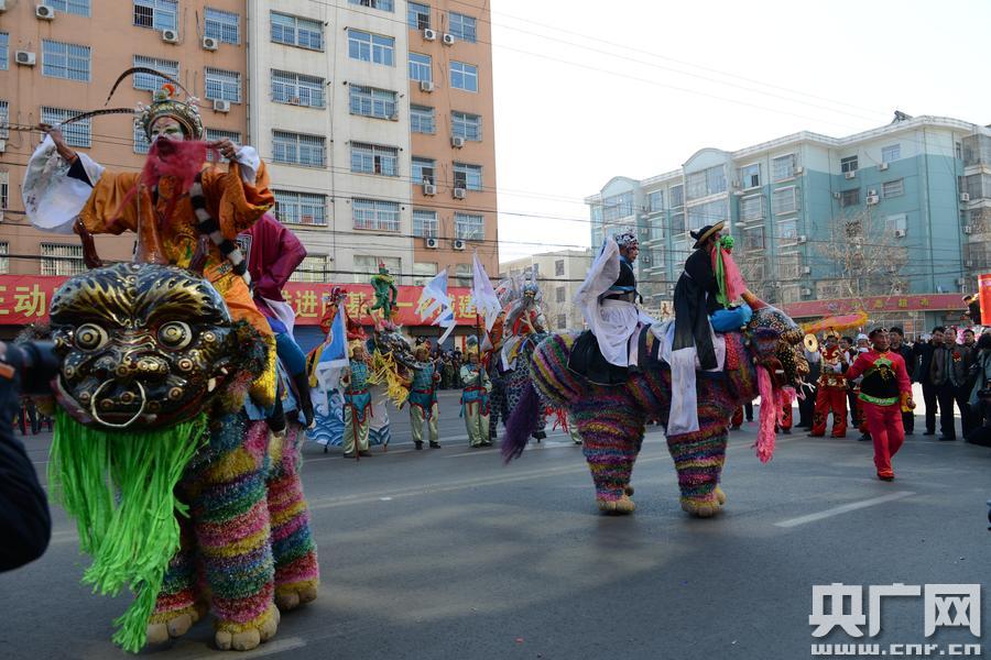 山西稷山:紅火鬧“春”社火表演 央廣網(wǎng)稷山2月14日消息(記者賀威通 通訊員楊明有)高臺(tái)花鼓敲起來,高蹺走獸抖起來,歡快秧歌扭起來,廣場舞蹈跳起來,社火鬧新春,稷山嗨起來…… 近日,后稷故里、紅棗之鄉(xiāng)山西稷山縣人頭攢動(dòng),熱鬧非凡。2017年“文明之春”大型社火表演活動(dòng)隆重舉行,為當(dāng)?shù)睾蛠碜詴x陜?cè)S河三角洲許多縣市的百姓獻(xiàn)上了一場豐盛的社火表演,讓群眾體驗(yàn)到民間文化藝術(shù)的魅力,度過了一個(gè)歡樂祥和的新春元宵佳節(jié)。 稷山,是中國農(nóng)耕始祖后稷培植五谷、教民稼穡的地方。在當(dāng)?shù),像我國北方地區(qū)一樣,正月十五元宵佳節(jié),群眾有元宵鬧社火的傳統(tǒng)習(xí)俗。稷山社火表演,以當(dāng)?shù)匚墨I(xiàn)史料、文化歷史淵源、傳統(tǒng)民間傳說和戲劇故事為題材,通過一個(gè)或一組人物展現(xiàn)一個(gè)故事,一個(gè)故事即為一轉(zhuǎn)社火。 當(dāng)日,艷陽高照,春寒料峭,稷峰街上氣氛熱烈,到處洋溢著歡聲笑語。上午10點(diǎn),社火表演在氣勢宏大、整齊劃一的百人旗隊(duì)中拉開序幕。稷山縣社火表演,來自當(dāng)?shù)乜h直機(jī)關(guān)單位和稷峰鎮(zhèn)各鄉(xiāng)村的64支社火代表隊(duì)選派節(jié)目,參加了元宵社火表演活動(dòng)。伴隨著歡快的音樂節(jié)奏,演員們精神飽滿,神采飛揚(yáng)。 舞龍、舞獅、抬閣、秧歌、高臺(tái)花鼓、高蹺走獸、馬拉鼓車等,具有濃郁地方特色的表演節(jié)目,盡現(xiàn)觀眾眼前。從站前路出發(fā)至振興路,約2公里長的隊(duì)伍,見首不見尾。 據(jù)了解,稷山民間社火,是春節(jié)期間傳統(tǒng)民間的自演自娛活動(dòng)。它來源于古老的土地與火的崇拜。跑旱船,跑竹馬,編隊(duì)穿梭奔馳、跳躍、對(duì)唱,樂感強(qiáng)烈,節(jié)奏鮮明,氣氛熱烈。稷山抬閣,縣境內(nèi)汾南汾北精心設(shè)計(jì)制作的抬閣,大多是集歷史故事、神話傳奇于一體,融繪畫、戲曲、彩扎、紙塑、雜技等藝術(shù)為一身的特色傳統(tǒng)民俗舞蹈,已經(jīng)有數(shù)千年的歷史。如牛郎織女、武圣關(guān)公、關(guān)公與貂蟬等等。 地處汾水河槽地帶的稷峰鎮(zhèn),這次參加縣里社火表演的抬閣,有的是一個(gè)演員伸出手臂,上面站立著另一個(gè)演員;有的是荷花高空盛開,一個(gè)小孩站在荷花上面左右旋轉(zhuǎn);有的是一個(gè)演員兩臂伸開,一手抓著一個(gè)小孩的辮子,小孩懸在空中一動(dòng)不動(dòng),高處的演員漫舒廣袖,輕輕擺動(dòng)身體,下面抬拉的人穩(wěn)步向前。有著悠久歷史淵源的稷王威風(fēng)鑼鼓,民間鼓樂中是枝奇葩,光彩奪目,是古老的民間藝術(shù)形式。以節(jié)奏強(qiáng)烈明快、場面壯闊粗獷為特點(diǎn),充分展示了稷王山下汾河兩岸群眾質(zhì)樸豪放的氣質(zhì)。稷王威風(fēng)鑼鼓,老百姓俗稱 "家伙",是集鑼、鼓、鐃、釵四種樂器合奏表演的一種傳統(tǒng)打擊鼓樂,并融音樂、舞蹈、技藝于一體,是稷山民間鼓樂的突出代表。 稷山花鼓,敲敲打打、扭扭唱唱。著男式表演服裝的演員為核心人物,在舞臺(tái)或村組中心地帶抱鼓表演,另有四個(gè)或八個(gè)著女裝的花鼓女圍著他表演,扭秧歌;ü臉逢(duì)在旁邊伴奏,而且每一個(gè)段落間還配有花鼓曲演唱,F(xiàn)在,抱鼓的由單人變?yōu)殡p人雙打,扭秧歌的花鼓人女由四人增至八人、十人。稷山花鼓在境域內(nèi)汾南、汾北各有不同,其中以汾南東蒲的花鼓和汾北桐上的花鼓最為著名。