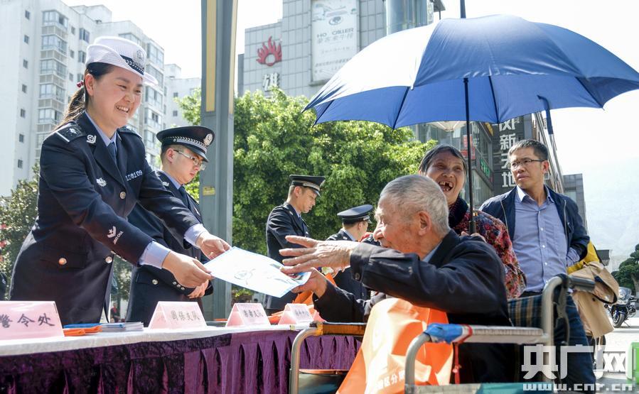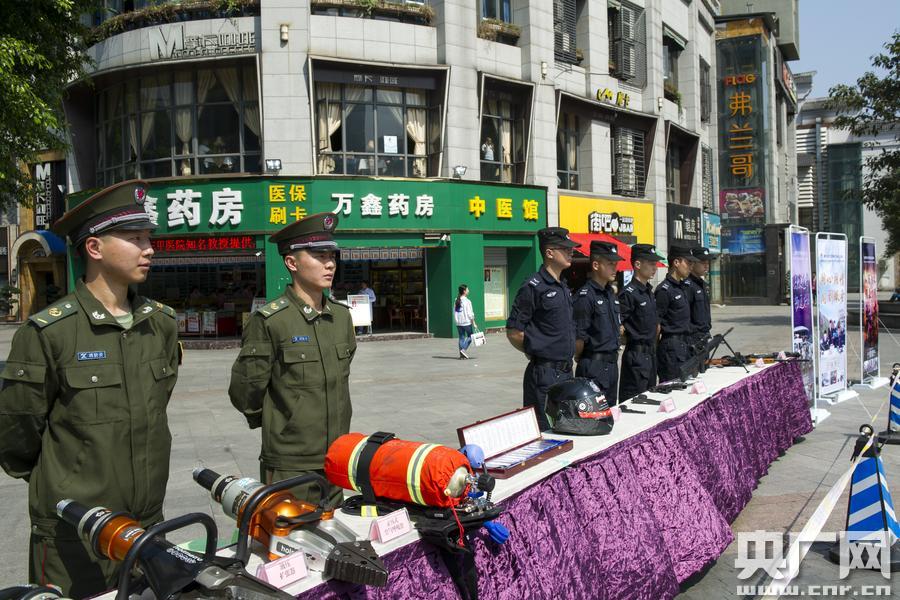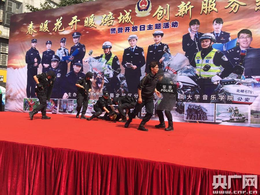民警現(xiàn)場(chǎng)表演徒手擒拿(央廣網(wǎng)記者 陳鵬 攝) 央廣網(wǎng)重慶4月15日消息(記者陳鵬)為增進(jìn)對(duì)公安民警的理解及支持,不斷拓展公安機(jī)關(guān)與人民群眾溝通聯(lián)系渠道,扎實(shí)推進(jìn)新時(shí)期和諧警民關(guān)系建設(shè)。4月14日下午,重慶北碚公安分局在嘉陵風(fēng)情步行街舉辦了2017年第一季度“警營(yíng)開(kāi)放日”活動(dòng);顒(dòng)中不僅有來(lái)自西南大學(xué)音樂(lè)學(xué)院的大學(xué)生帶來(lái)的歌舞表演,公安民警還擺出展臺(tái),展示槍械、軍用無(wú)人機(jī)等,現(xiàn)場(chǎng)給市民講解“警營(yíng)的豐富生活”。 此次“警營(yíng)開(kāi)放日”活動(dòng)以“春暖花開(kāi)暖碚城,創(chuàng)新服務(wù)系民生”為主題,緊緊圍繞窗口服務(wù)、便民提醒、法制宣傳、安全防范、裝備展示、警務(wù)公開(kāi),警民互動(dòng)等相關(guān)內(nèi)容展開(kāi)。交巡警支隊(duì)、出入境管理支隊(duì)和人口管理支隊(duì)的窗口民警,結(jié)合警務(wù)工作實(shí)際,在現(xiàn)場(chǎng)講解了《車(chē)輛服務(wù)指南》、《出入有境 服務(wù)無(wú)境》和《身份證的知識(shí)》等內(nèi)容;顒(dòng)還邀請(qǐng)了西南大學(xué)音樂(lè)學(xué)院和分局特警支隊(duì)參現(xiàn)場(chǎng)與表演。 活動(dòng)期間,共發(fā)放宣傳資料2000余份,發(fā)放便民雨傘200把,接受群眾咨詢(xún)200余次, 近2000余名群眾參與;顒(dòng)增強(qiáng)了人民群眾的安全防范意識(shí),提高市民安全防范能力,及時(shí)回應(yīng)廣大人民群眾對(duì)公安機(jī)關(guān)的新期待、新要求,展示新時(shí)期公安機(jī)關(guān)立警為公、執(zhí)法為民的良好形象,提升了轄區(qū)群眾的滿(mǎn)意度和安全感。