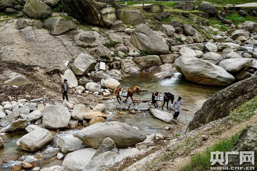 騾馬馱著石材艱難上山,用于翻修景區(qū)老路。 -