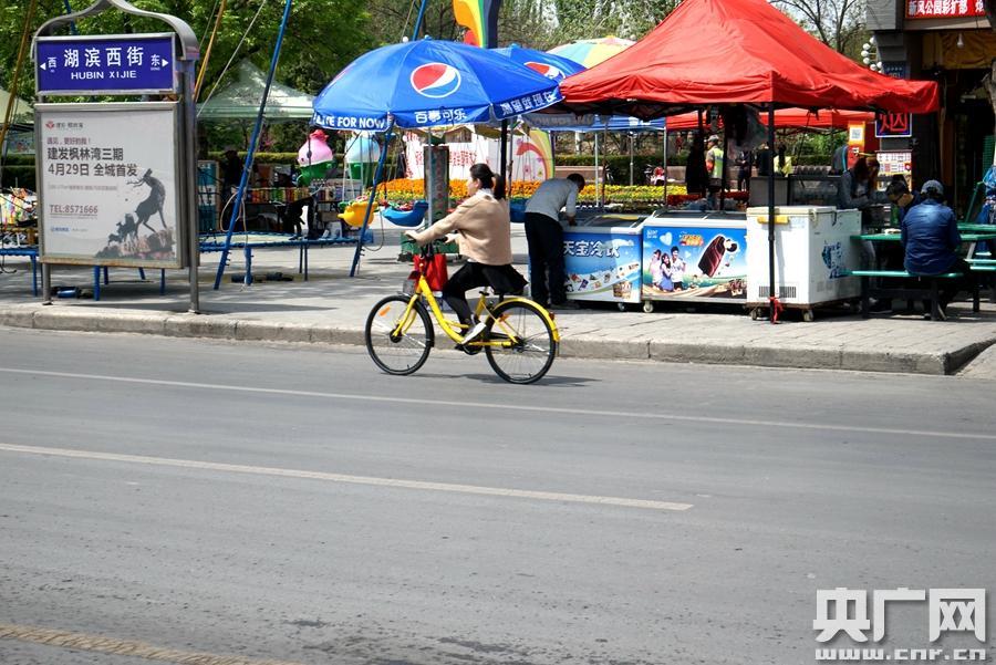 市民騎行(央廣網(wǎng)實(shí)習(xí)記者靳樹言 攝) 4月13日,銀川市政府和北京摩拜科技有限公司和北京拜克洛克科技有限公司簽定合作協(xié)議,引進(jìn)摩拜和OFO兩家共享單車投放銀川三區(qū)及濱河新區(qū)。 -