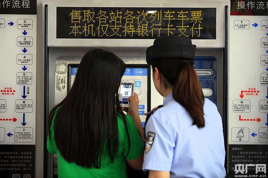 1名民警在南充火車(chē)站向旅客講解自助購(gòu)票時(shí)手機(jī)支付系統(tǒng)的安全使用方法