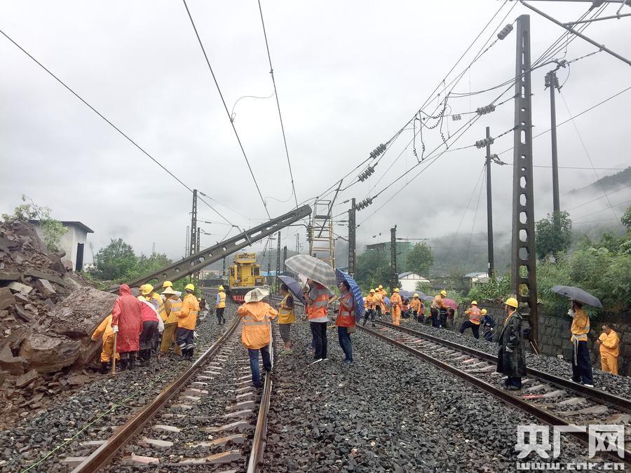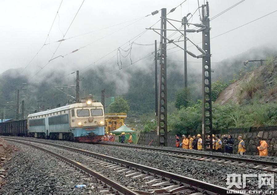 成都供電段全力投入內(nèi)六線及寶成線搶險工作(央廣網(wǎng)發(fā) 胡志強(qiáng)攝) “雨越下越大,工區(qū)已經(jīng)出動了4次雨中巡視,看著這雨絲毫沒有停下的意思!26日凌晨2時許,白鐘佩給車間主任秦波發(fā)去了短信,此時他的擔(dān)憂越來越大。 6時33分,工區(qū)值班員黎遠(yuǎn)昆接到該段調(diào)度指揮中心值班人員電話通知,寶成線竹園壩變電所竹(園壩)斑(竹園)下行線供電臂跳閘,重合不成功,要求出動巡視檢查設(shè)備。工區(qū)立即組織人員出動,6時37分,人員到達(dá)現(xiàn)場,赫然發(fā)現(xiàn),寶成線竹園壩站下行線13號接觸網(wǎng)支柱隨滑坡的山體傾倒,接觸網(wǎng)受損嚴(yán)重。白鐘佩立即通知駐站聯(lián)絡(luò)員王協(xié)建申請封鎖線路。 -