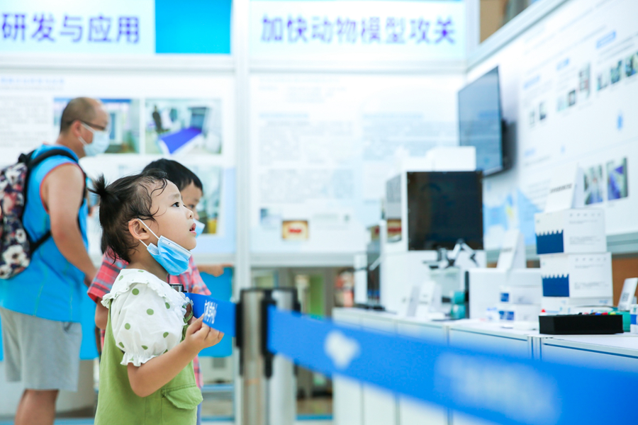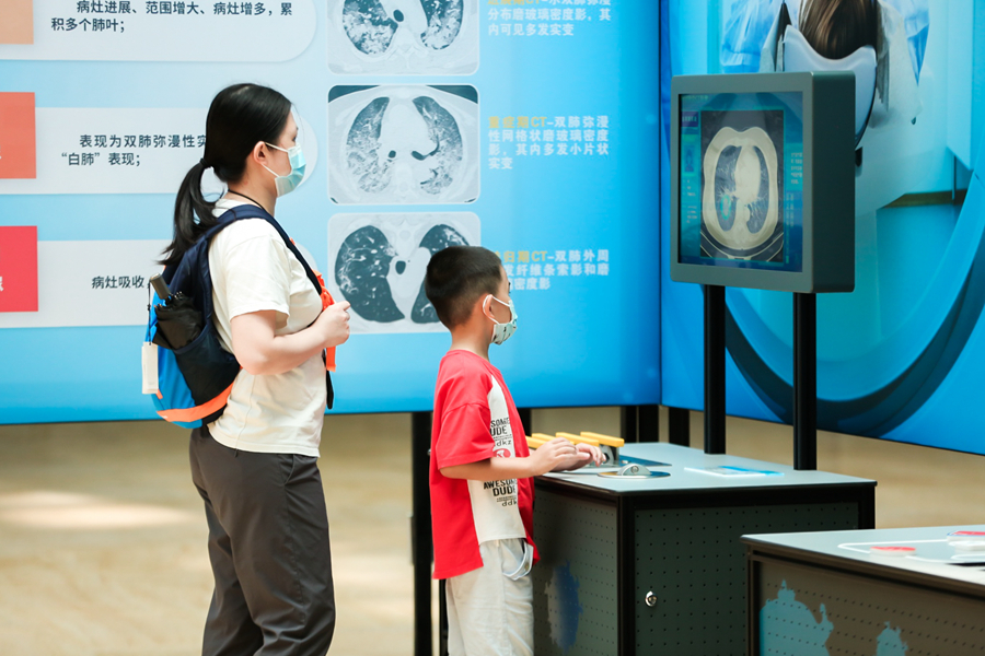 現(xiàn)場,公眾不僅可看到“肺炎1號(hào)”等藥物、腺病毒載體疫苗等研發(fā)進(jìn)展、AI影像輔助診斷系統(tǒng)等檢測(cè)診斷產(chǎn)品、可重復(fù)使用的N95口罩等防控科技成果展示,還可以成為新冠病毒偵探,用“放大鏡”