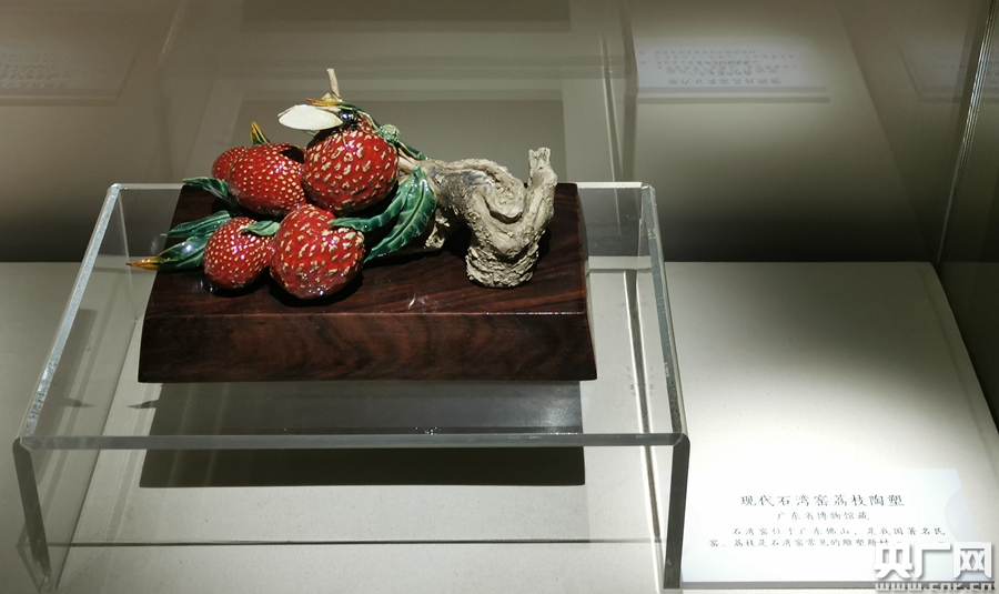 “不辭長作嶺南人——荔枝文化展”在廣東省博物館開幕。圖為現(xiàn)代石灣荔枝陶塑(央廣記者 鄭澍 攝)