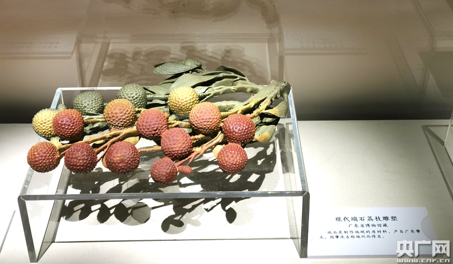 “不辭長作嶺南人——荔枝文化展”在廣東省博物館開幕。圖為現(xiàn)代端石荔枝雕塑(央廣記者 鄭澍 攝)