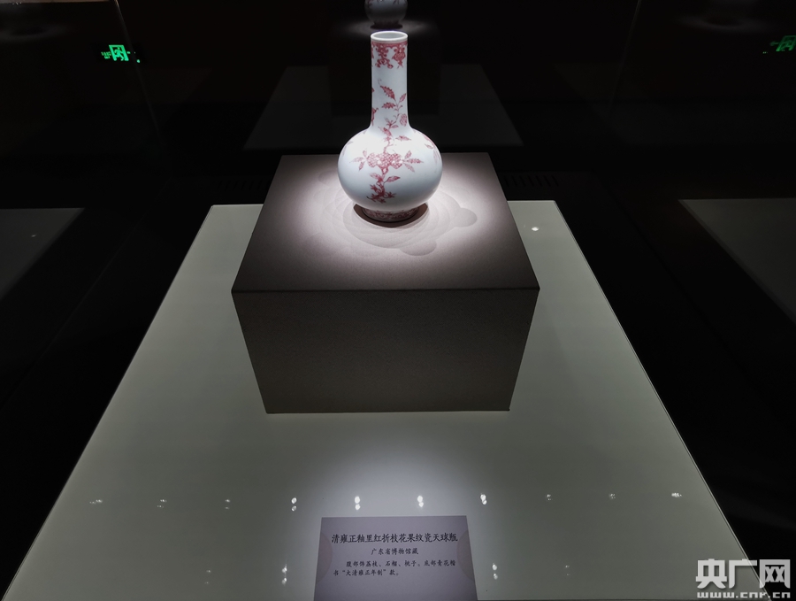 “不辭長作嶺南人——荔枝文化展”在廣東省博物館開幕。圖為清雍正釉里紅折枝花果紋瓷天球瓶(央廣記者 鄭澍 攝)