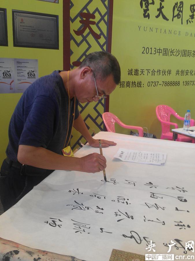在一個(gè)展臺(tái)前,安化縣書協(xié)主席蔣穩(wěn)巖揮毫潑墨忙得不亦樂乎,現(xiàn)場(chǎng)求字的觀眾排起了長(zhǎng)隊(duì)!安瓒U一味”等與茶關(guān)聯(lián)的書法作品鋪滿了展臺(tái)的前前后后。一位退休老同志在這里義務(wù)幫他研磨、按紙忙活了4天,他興奮地告訴記者,做“書法志愿者”的目的就是為了跟蔣主席學(xué)點(diǎn)“絕活”。