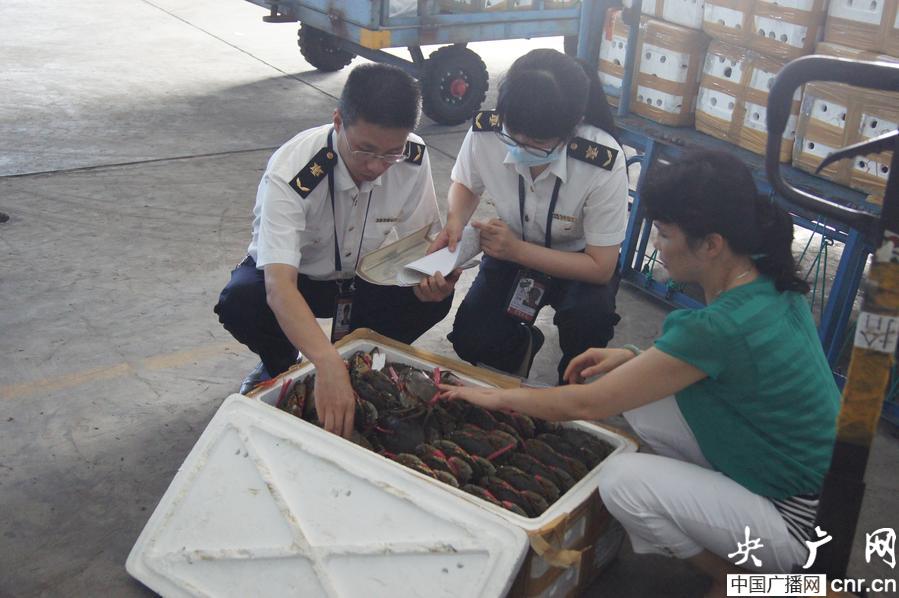 福建檢驗(yàn)檢疫局福州機(jī)場(chǎng)辦工作人員在現(xiàn)場(chǎng)查驗(yàn)印尼青蟹(央廣網(wǎng)記者 張子亞 攝)