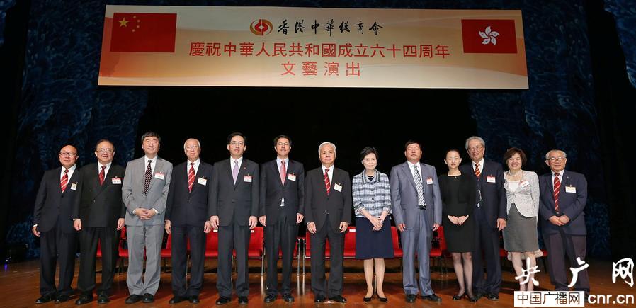 中央政府駐港聯(lián)絡(luò)辦公室張曉明主任(左六)、香港特別行政區(qū)政務(wù)司林鄭月娥司長(右六)、外交部駐港特派員公署洪小勇署理特派員(左五)及解放軍駐港部隊(duì)海軍參謀長方玉信大校(右五)聯(lián)同中總楊釗會長(右七)及其他中總首長嘉賓合照(央廣網(wǎng)發(fā) 圖片由香港中華總商會提供)
