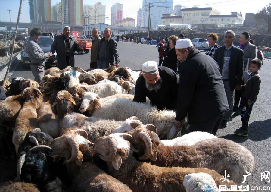 各族市民在活畜臨時交易點買羊(央廣網(wǎng)記者 張雷 攝)