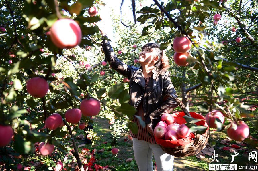 央廣網(wǎng)北京10月23日消息(記者李文蕊 通訊員鄭學(xué)偉)日前,北京延慶香營鄉(xiāng)千余畝蘋果成熟上市,吸引眾多游客前來采摘購買。這里是北京延慶果品大鄉(xiāng),該地區(qū)位于山前暖光帶,光照充足、晝夜溫差大,是優(yōu)質(zhì)蘋果產(chǎn)區(qū),生產(chǎn)的蘋果具有果型正、個頭大、品質(zhì)好、口感好、耐儲存等特點,主要品種有富士、國光、葵花、勝利。圖為游客在采摘有機蘋果。