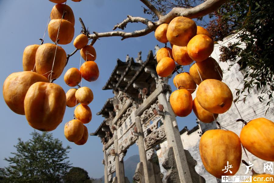 安徽歙縣上豐、許村燈籠柿成熟采摘,農(nóng)民們將紅透的柿子采摘直接出售,或削皮、晾曬、腌制加工成柿餅提高附加值。燈籠柿促進當?shù)剞r(nóng)民增收,為攝影愛好者增設了一道美景。