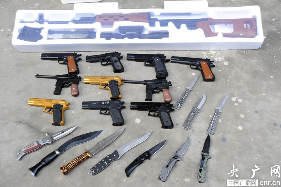 查獲的管制刀具和仿真槍?zhuān)ㄑ霃V網(wǎng)發(fā) 馮忠海 攝)