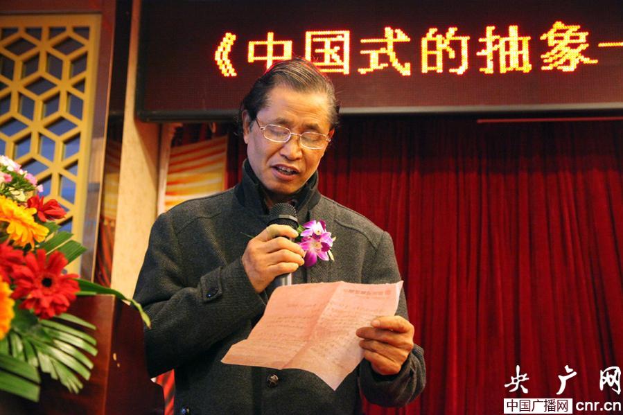 周鵬生先生在其山水雕塑精品展開幕式上介紹自己山水雕塑藝術(shù)探索過程。(央廣網(wǎng)記者 黎政祥 攝)