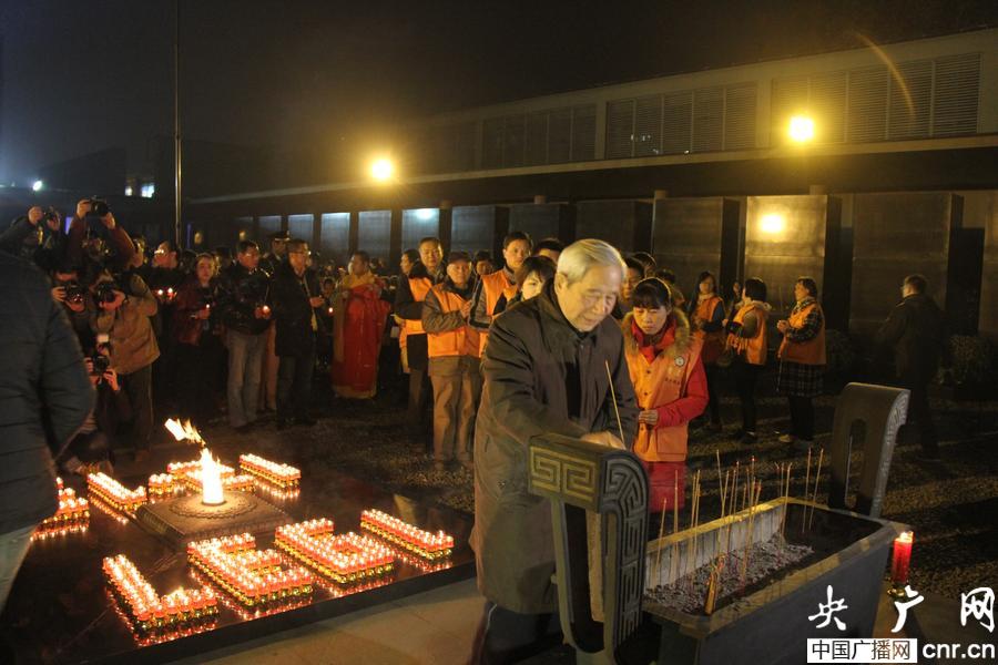 12日晚8時許,祭場黑色花崗巖無字紀念碑前,3000只紅燭被依次點亮,排成“1937.12.13”的造型,與搖曳的長明火一起劃破了沉沉夜空,在南京毗盧寺和日本京都府真宗大谷派東本愿寺僧侶們的頌經(jīng)聲中,中國、日本、韓國、菲律賓等國的100余名和平人士秉燭祈禱,向大屠殺遇難者鞠躬敬香。