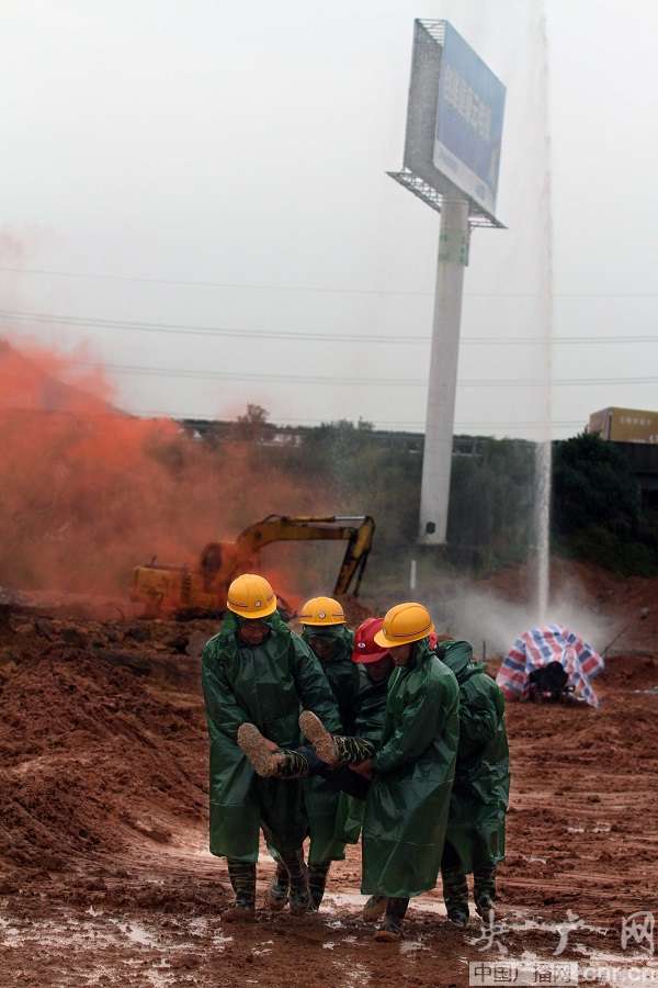 來自廈門市公安、消防、交警、電力、水務(wù)、環(huán)保、民防、石化等16家應(yīng)急聯(lián)動單位的35臺車輛、280余人參加演練。演練假設(shè)因市政道路施工不慎,挖掘機將中石化成品油輸油管道挖破,造成輸油管道內(nèi)油品泄漏。管道挖破瞬間,噴射而出的油品呈霧狀散落,隨時有燃爆的可能。泄漏點附近的2名工人因吸入過量油氣暈倒。