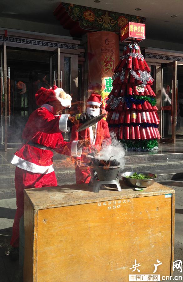 央廣網(wǎng)12月24日消息(記者德慶白珍 羅布次仁)為深刻吸取近期重大火災(zāi)事故教訓(xùn),切實(shí)營造全民參與消防宣傳教育的良好氛圍。今天下午,西藏消防總隊(duì)在拉薩百貨商場(chǎng)門口用140多具廢舊滅火器空瓶搭設(shè)3米多高的圣誕樹,官兵裝扮圣誕老人給過往市民發(fā)放防火宣傳手冊(cè)、贈(zèng)送印有消防安全知識(shí)的文具盒、撲克、水杯等小禮物,同時(shí)在現(xiàn)場(chǎng)傳授廚房火災(zāi)應(yīng)急處置方法幫助群眾度過一個(gè)祥和、安全的平安夜。