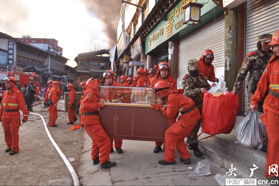 古城大火從一民房引發(fā)后,當(dāng)?shù)販缁鹆α烤o急進(jìn)行了撲救,但由于古城房屋均以木結(jié)構(gòu)建筑為主,大火很快蔓延到古城大部分房屋,并直接威脅緊鄰古城的重點(diǎn)景區(qū)大佛寺的安全。為阻止大火燒毀古寺,迪慶森林大隊(duì)積極請領(lǐng)任務(wù),擔(dān)負(fù)保護(hù)大佛寺安全的任務(wù)。他們迅速阻止官兵清除古寺周邊建筑木質(zhì)可燃物,降低大火蔓延強(qiáng)度,并古城外圍架設(shè)森林消防水泵,向大佛寺遠(yuǎn)距離輸水撲打蔓延到古寺周邊的大火。同時(shí),積極抽調(diào)官兵轉(zhuǎn)移少數(shù)民族受災(zāi)群眾,幫助他們搶運(yùn)屋內(nèi)物資,提供簡單醫(yī)療服務(wù)。