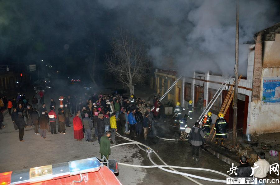 據(jù)介紹,當(dāng)日20時(shí)30分,夏河、合作兩地消防中隊(duì)出動(dòng)4臺(tái)水罐消防車、26名消防人員于21時(shí)03分到達(dá)現(xiàn)場進(jìn)行處置。消防官兵趕到時(shí),看到火災(zāi)現(xiàn)場濃煙滾滾,火借風(fēng)勢仍然不斷擴(kuò)大,危及毗連民居。消防官兵分兩路救援,一路正面搭梯上樓滅火,另一路在側(cè)面不斷轉(zhuǎn)換水槍陣地,防止大火蔓延至毗連房屋。經(jīng)過近1個(gè)小時(shí)的撲救,火勢得到有效控制。至22時(shí)10分,大火被完全撲滅,消防官兵在低溫嚴(yán)寒中仍堅(jiān)守現(xiàn)場,對火場進(jìn)行全面清理,確保不再復(fù)燃。