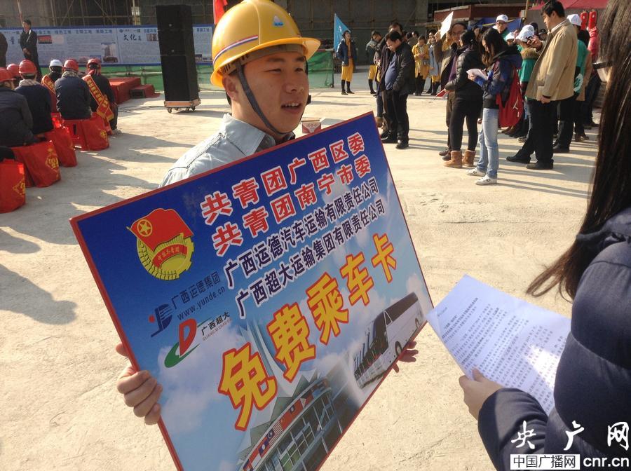 央廣網(wǎng)南寧1月14日消息(記者張壘 許大為 鄧君洋)1月14日上午, “讓溫暖一起回家” 2014年廣西服務(wù)萬名外出務(wù)工青年春節(jié)返鄉(xiāng)主題系列活動(dòng)在廣西建工集團(tuán)項(xiàng)目工地上正式啟動(dòng)。儀式上,優(yōu)秀外出務(wù)工青年獲贈(zèng)新年大禮包和返鄉(xiāng)車票。